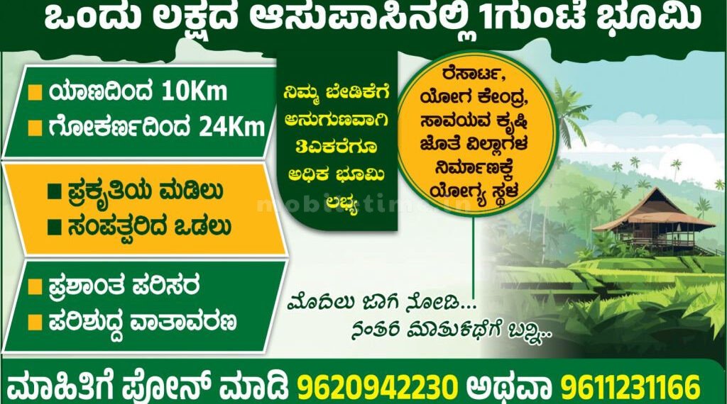 ಉತ್ತರ ಕನ್ನಡ ಜಿಲ್ಲೆಯ ಹೃದಯಭಾಗವಾದ ಯಾಣ-ಗೋಕರ್ಣದ ನಡುವೆ 3.13 ಎಕರೆ ಜಾಗ ಮಾರಾಟಕ್ಕಿದೆ. ಅವರವರ ಅಗತ್ಯಕ್ಕೆ ಅನುಗುಣವಾಗಿ ಗುಂಟೆ ಲೆಕ್ಕದಲ್ಲಿಯೂ ಜಾಗ ಸಿಗುತ್ತದೆ. ಇಲ್ಲವೇ ಮೂರುಕಾಲು ಎಕರೆಯನ್ನು ಖರೀದಿಸುವವರಿಗೂ ಯೋಗ್ಯ ಬೆಲೆಗೆ ಜಾಗ ಕೊಡಲಾಗುತ್ತದೆ. ಯಾಣದಿಂದ 10ಕಿಮೀ ಹಾಗೂ ಗೋಕರ್ಣದಿಂದ 24ಕಿಮೀ ದೂರದಲ್ಲಿರುವ ಈ ಜಾಗ ಪ್ರವಾಸೋದ್ಯಮ ಚಟುವಟಿಕೆ ನಡೆಸುವರಿಗೆ ಸಹ ಹೇಳಿ ಮಾಡಿಸಿದ ಪ್ರದೇಶ. ಕಾರಣ ಪ್ರಸಿದ್ಧ ವಿಭೂತಿ ಜಲಪಾತ ಸಹ ಇಲ್ಲಿಂದ 8ಕಿಮೀ ಮಾತ್ರ. ಜೊತೆಗೆ ಮಿರ್ಜಾನ್ ಕೋಟೆ, ಕಡಲತೀರಗಳೆಲ್ಲವೂ ಇಲ್ಲಿಂದ ತೀರಾ ಹತ್ತಿರ.