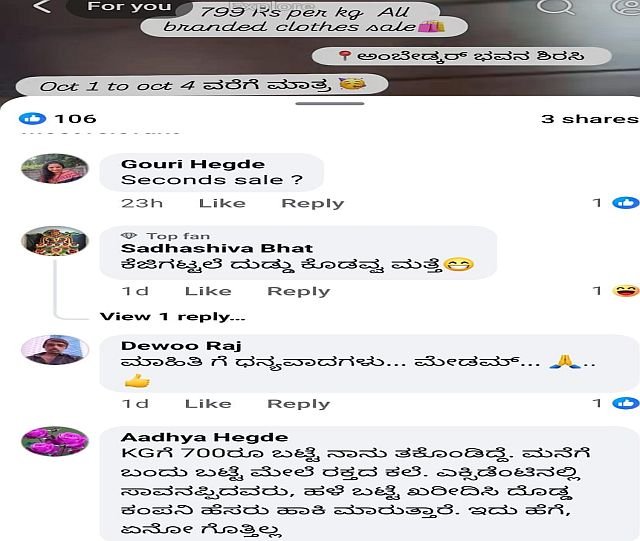 `ಕೆಜಿಗೆ 700ರೂ ಕೊಟ್ಟು ಬಟ್ಟೆ ಖರೀದಿಸಿದಾಗ ತನಗೂ ಇಂಥ ಕೆಟ್ಟ ಅನುಭವ ಆಗಿದೆ’ ಎಂದು ವಿಡಿಯೋವೊಂದರ ಅಡಿಭಾಗ ಆದ್ಯಾ ಹೆಗಡೆ ಅವರು ಅನಿಸಿಕೆ ಹಂಚಿಕೊoಡಿದ್ದಾರೆ. `ಸೆಕೆಂಡ್ ಸೆಲ್?’ ಎಂದು ಗೌರಿ ಹೆಗಡೆ ಅವರು ಪ್ರಶ್ನಾರ್ಥಕ ರೂಪದಲ್ಲಿ ಬರೆದುಕೊಂಡಿದ್ದಾರೆ. `ಕೆಲವೊಮ್ಮೆ ಪ್ರಚಾರಕ್ಕಾಗಿ ಕೆಲ ಕಂಪನಿಯವರು ಕಡಿಮೆ ದರದಲ್ಲಿ ಬಟ್ಟೆ ಮಾರಾಟ ಮಾಡುತ್ತಾರೆ. ಬೆಂಗಳೂರು ಸೇರಿ ವಿವಿಧ ಕಡೆ ಇಂಥ ಕಂಪನಿಗಳಿವೆ. ಆದರೆ, ಅಲ್ಲಿ ಒಂದೇ ಬ್ರಾಂಡಿನ ಬಟ್ಟೆಗಳು ಕಡಿಮೆ ದರದಲ್ಲಿ ಸಿಗುತ್ತದೆ. ಸದ್ಯ ಎಲ್ಲಾ ಕಂಪನಿ ಬಟ್ಟೆಗಳು ಒಂದೇ ಕಡೆ ಬೊಗಸೆ ತುಂಬಿ ಕೊಡುವುದು ಅನುಮಾನಕ್ಕೆ ಕಾರಣ’ ಎನ್ನುವವರು ಇದ್ದಾರೆ.