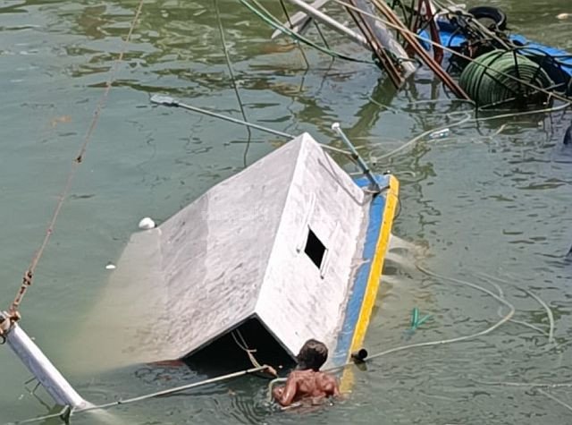 ಅಂಕೋಲಾದ ಬೇಲಿಕೇರಿ ಬಂದರಿನಲ್ಲಿ `ಶ್ರೀ ಶಾರದಾಂಬಾ’ ಹೆಸರಿನ ದೋಣಿ ಲಂಗರು ಹಾಕಿತ್ತು. ಗುರುವಾರ ಅಬ್ಬರಿಸಿದ ಅರಬ್ಬಿ ಸಮುದ್ರದ ಅಲೆಗಳು ಆ ದೋಣಿಯನ್ನು ಬುಡಮೇಲು ಮಾಡಿತು. ಪರಿಣಾಮ ದೋಣಿಯ ಒಳಗಿದ್ದ ಬಲೆ ಹಾಗೂ ಇನ್ನಿತರ ಸಾಮಗ್ರಿಗಳು ನೀರುಪಾಲಾದವು.