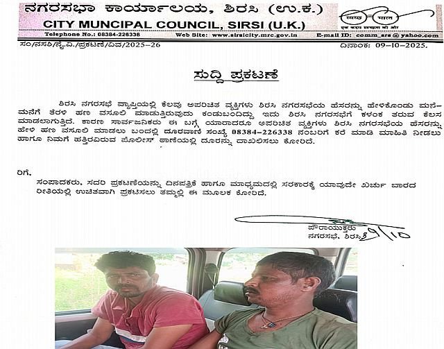 ಶಿರಸಿ ನಗರಸಭೆ ಹೆಸರಿನಲ್ಲಿ ಮನೆ ಮನೆಗೆ ತೆರಳಿ ಹಣ ವಸೂಲಿ ಮಾಡುತ್ತಿದ್ದ ಇಬ್ಬರ ಫೋಟೋ ಬಹಿರಂಗವಾಗಿದೆ. ಆದರೆ, `ಹಣ ವಸೂಲಿ ಮಾಡುವವರ ಬಗ್ಗೆ ಮಾಹಿತಿ ಕೊಡಿ’ ಎಂದು ಶಿರಸಿ ನಗರಸಭೆ ನೀಡಿದ ಸಂಖ್ಯೆಗೆ ಫೋನ್ ಸಂಪರ್ಕವೇ ಇಲ್ಲ!
