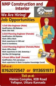 ಕಟ್ಟಡ ನಿರ್ಮಾಣ, ವಿನ್ಯಾಸ ಹಾಗೂ ನೀಲ ನಕ್ಷೆ ರಚನೆ ವಿಷಯದಲ್ಲಿ ಶ್ರಮಿಸುತ್ತಿರುವ ಯಲ್ಲಾಪುರದ NMP Construction and Interior ಹಲವು ಉದ್ಯೋಗ ಅವಕಾಶಗಳಿಗೆ ಅರ್ಜಿ ಕರೆದಿದೆ. 2010ರಲ್ಲಿ ಶುರುವಾದ ಈ ಕಂಪನಿ ಈವರೆಗೆ ನೂರಾರು ಕಟ್ಟಡಗಳ ನಿರ್ಮಾಣದಲ್ಲಿ ಪ್ರಮುಖ ಪಾತ್ರವಹಿಸಿದ್ದು, ಈ ಕಂಪನಿ ಜೊತೆ ಕೈ ಜೋಡಿಸಿ ದುಡಿಯುವವ ಅರ್ಹ ಅಭ್ಯರ್ಥಿಗಳಿಗಾಗಿ ಹುಡುಕಾಟ ನಡೆದಿದೆ.